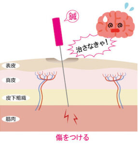 鍼の刺激により、体内では異物が入ってきたと、血管を広げ、血液が集まり、悪いところを修復しようとしたり、不要なものを排除したり、酸素や栄養を送ったりする事で、身体の自己治癒力を高めています。